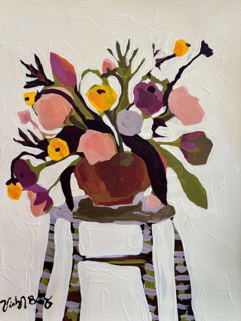 Toria likes to create artwork with the hope it will offer people a moment of joy or delight. Her paintings often draw inspiration from the beauty of flowers. This subject matter allows her to focus on playing with shape and color to create interesting organic shapes. Her illustrations are inspired by motherhood and her infant daughter, often depicting silly baby moments or playful imagery akin to nursery art. Her quilts are an exploration of repurposing second hand or cherished textiles, mixing shapes to form patterns and color combinations. These labors of love are usually intended for family and friends, especially for expectant or new parents.