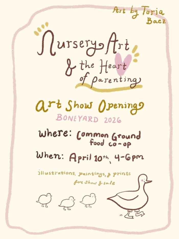 “Nursery Art & the Heart of Parenting” is an art project meant to acknowledge the joy parents share with their children, document it through art, and share it with the community. Through interviews, I listened and noticed where imagery arose from individual child rearing experiences. I then made personalized nursery-esque artwork based on each parent’s experience. These creations will be shared during Boneyard and into early May in honor of Mother's Day. For those interested in purchasing a work of art for themselves or as a Mother's Day gift, I will have prints from my newsletter, "art as i go...", original floral paintings, and illustrations for sale.