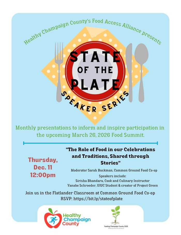 Healthy Champaign County's Food Access Alliance presents the State of the Plate Speaker Series, monthly presentations to inform and inspire participation in the upcoming March 26, 2026 Food Summit.