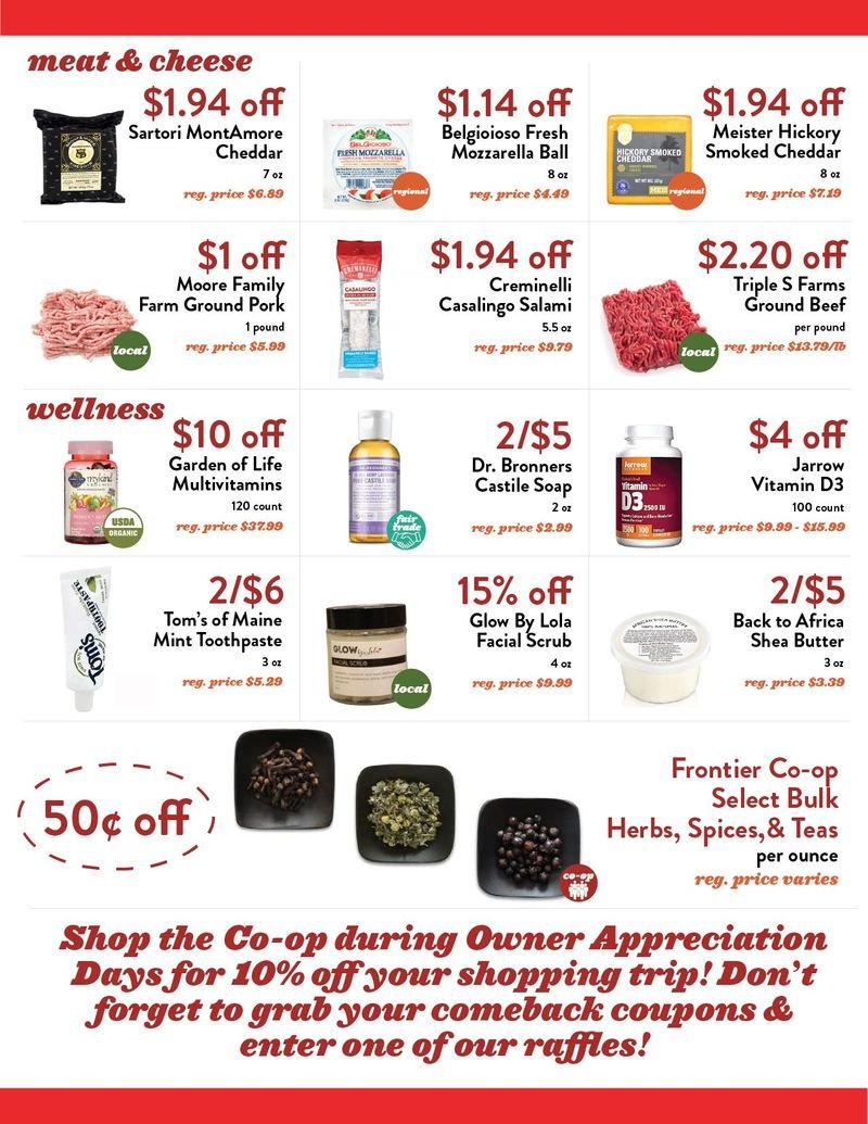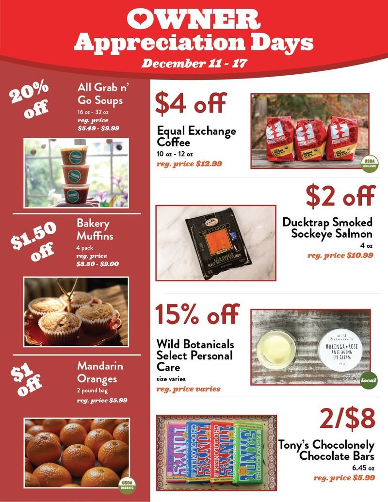 Because our Food Co-op is community-owned by over 12,000 neighbors and counting, Owner Appreciation Days are our special sales celebration where all of our Co-op owners can get great store-wide deals! Owner Appreciation Days is a full 7 days (Wednesday, December 11th - Tuesday, December 17th) to encourage safe shopping, reduce crowds, and allow customers to maintain their regular shopping schedule. We're stocking up on all these great deals, so there will be enough for everyone! Like all Owner Days, owners will receive a 10% discount off their entire purchase of one shopping trip of their choice (excluding Co+op Basics, alcohol, and items already on sale).