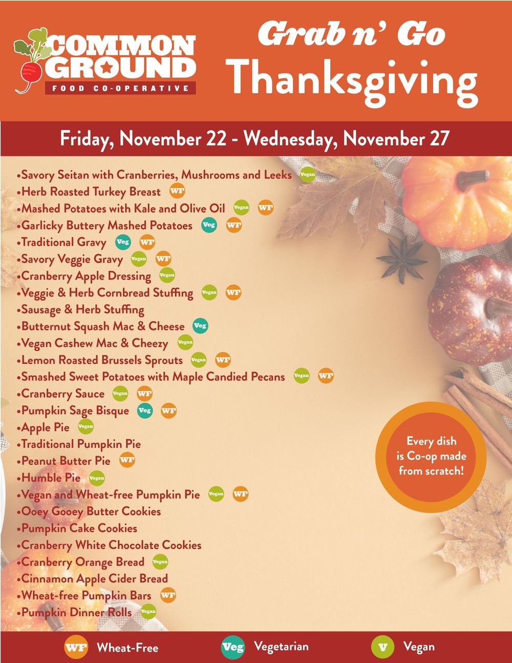 Join us for this year's Grab n' Go Thanksgiving! Our kitchen and bakery have created a full menu to supplement your special holiday meal. Starting Friday, November 22nd - Wednesday, November 27th, our Grab n' Go case will be transformed with delicious dishes made from scratch using organic ingredients. Grab entrees, essential sides, and our seasonal pies and baked goods!