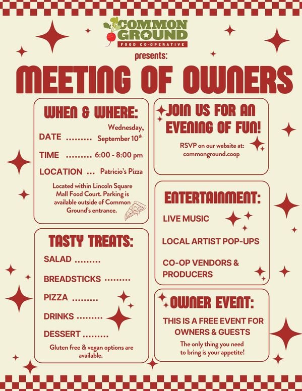 This is a free event for Owners and guests. The only thing you need to bring is your appetite! There will be live music, local artist pop-ups, and Co-op vendors and producers. There will also be free salad, breadsticks, and pizza from Patricio's Pizza as well as drinks and desserts provided by the Co-op. Gluten free and vegan options are available.